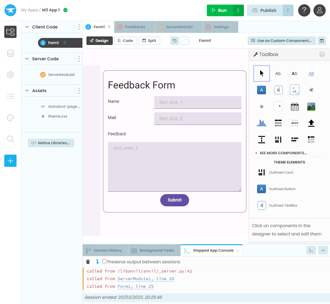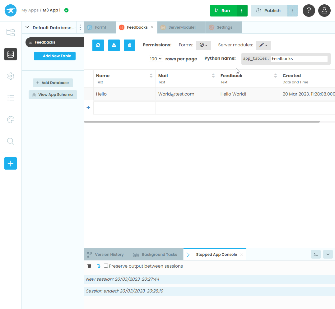 위의 코드블럭은 anvil의 데코레이터로 server.callable 래핑하여 함수로 넘어오는 name, email, feedback 인자들을 이전 단계에서 정의한 "feedbacks" DB 테이블에 추가시켜주는 함수다. (데코레이터란? - 2023.03.05 - [잡지식 저장고/Python] - 데코레이터란 : Python Decorator 예시집 - 1)