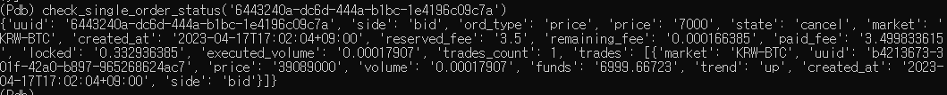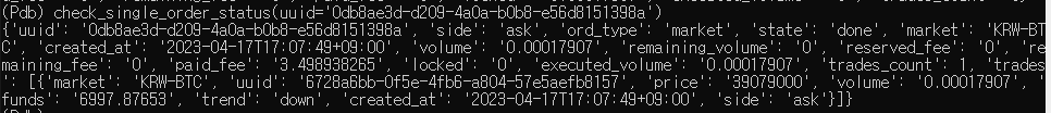 제일 먼저 가장 최근에 수행된 시장가 매도(uuid '0db8ae3d-d209-4a0a-b0b8-e56d8151398a')에 대한 정보를 조회해보면 아래와 같이 수행할 수 있다. 상기 주문 직후 결과에서는 wait이던 거래가 done으로 바뀌어 체결상태로 넘어간걸 확인할 수 있다.