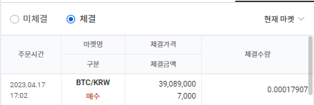 해당 주문이 제대로 들어갔는지 확인하기 위해서 매매 홈페이지에 들어가 거래내역을 조회해보면, 체결내역에 상기 거래가(created at 2023-04-17T17:02:04) 정상적으로 조회되는걸 볼 수 있다.