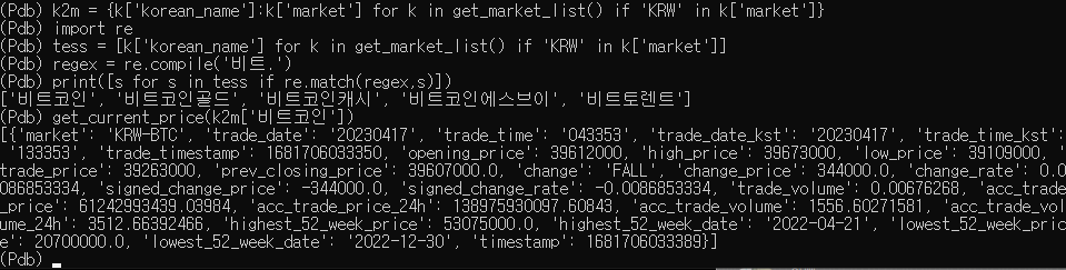 중간에 잠깐 나오는 re 라이브러리의 정규 표현식 wild-card 검색을 이용한 시장 검색 기능은 추후 어플리케이션 프론트엔드 연동 시 추가적으로 다루도록 하겠다.