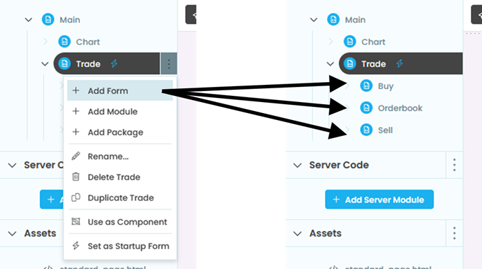 먼저, Trade Form 밑에 Orderbook, Buy, Sell 의 빈 Form 들을 새로 생성해주자.