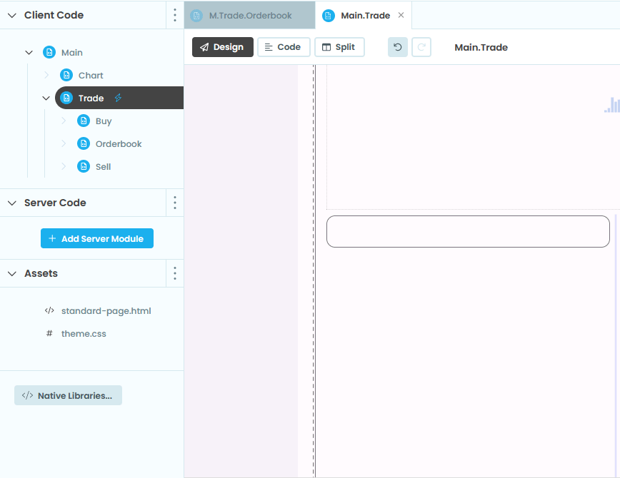 이렇게 Orderbook Form을 완성했으면 아래와 같이 M.Trade Form에서 self.orderbook 카드에 Orderbook Form을 끌어다가 배치해준다