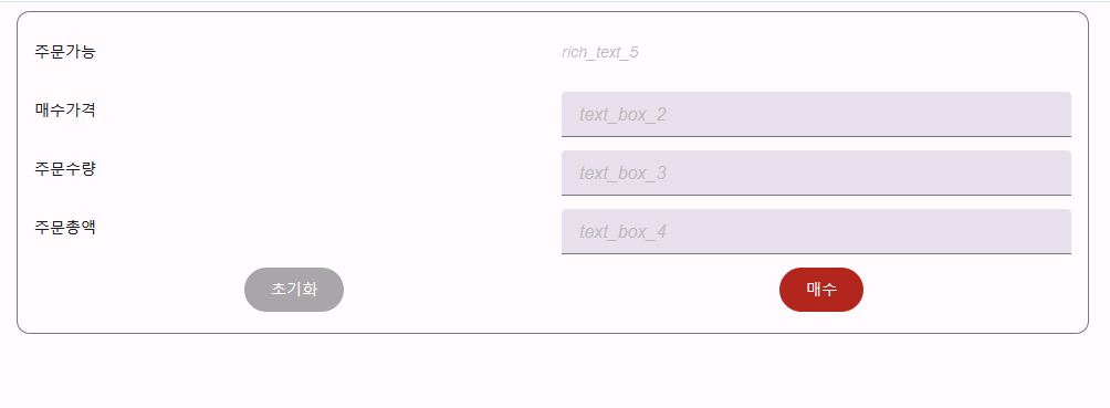 이와 비슷하게 매도 창도 구성한 다음 해결해야하는 문제는 매수와 매도 버튼을 눌렀을 때 해당하는 Form이 아래에 뜨도록 하는 것인데, 이는 이전 포스팅에서도 언급했던 Tab화 기법을 이용해서 해결한다.
