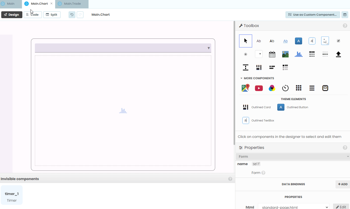 가장 먼저 차트 탭을 채워주자. 차트 탭은 Timer를 이용해서 사용자가 선택한 시장에 대해 실시간 candle chart를 보여주는 기능을 수행한다. 이전 Anvil 기능편 Timer 포스팅을 참고해서 아래와 같이 완성해준다.