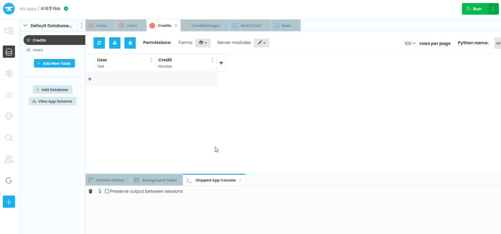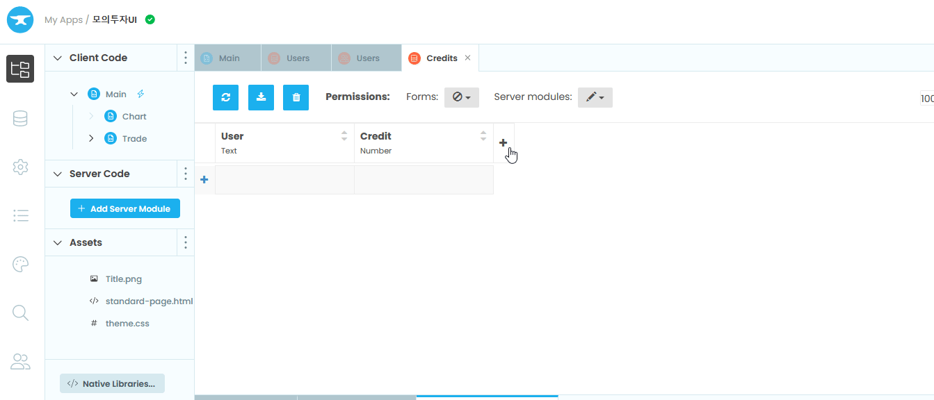 이제 신규 유저가 들어왔을 경우 100,000 원을 할당하도록 코드를 작성해줄건데, 기본적으로 DB 테이블은 클라이언트가 아니라 서버에서만 접근 및 수정이 가능하도록 권한 설정이 되어있으므로 신규유저인지 여부를 판단할 수 있도록 Form에서의 Read 권한을 열어주고, 수정을 담당할 CreditManager 서버 모듈을 추가해준다.