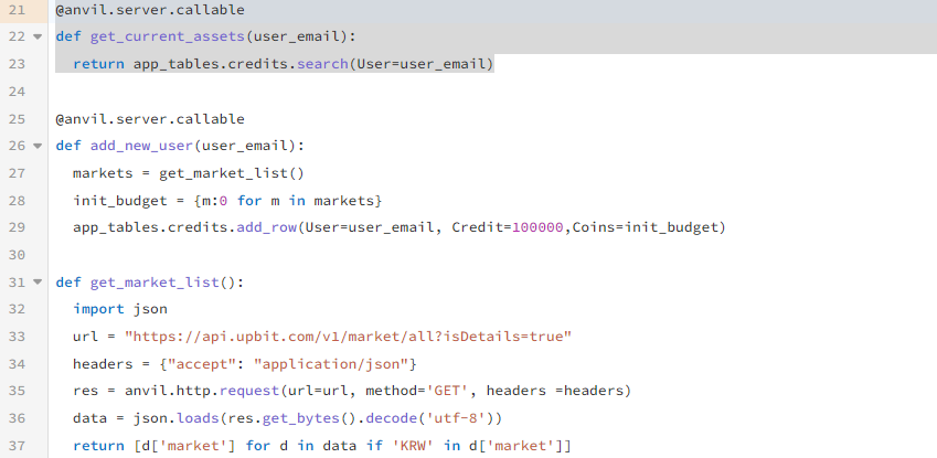 get_current_assets 함수를 서버쪽에서 서비스 할 수 있도록 아래와 같이 서버 코드를 추가해준다. 상기 유저관리 부분에서 생성해둔 'CreditManager' 서버코드에 아래와 같은 callable을 추가해주면 매우 간단하게 완성. app_tables에서 미리 만들어둔 credits 테이블을 읽어와서 그 중 user_email이 현재 유저와 같은 부분을 가져온다.