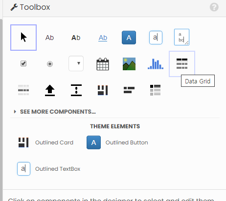 Data Grid를 처음 추가하면 아래와 같이 총 3개의 column을 가진 데이터 테이블이 생성되는데, 우리는 Asset 종류와 양(Quantity) 만 필요하므로, Toolbox에서 스크롤을 좀 더 내려 데이터그리드의 속성을 아래와 같이 변경해주도록 하자.
