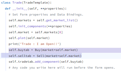 제일 먼저, 현재 상태를 Query 하기 위해서는 선택한 시장 정보와 이전 글의 말미에서도 볼 수 있듯이 사용자 email 정보가 필요하므로 초기화 코드부터 손 볼 필요가 있다. __init__ 부분에서 각각 현재 로그인한 유저의 정보를 획득하고, 이에 따른 현재 정보를 1차로 쿼리하도록 한다. 또한, Buy 와 Sell의 부모 컴포넌트인 Trade 컴포넌트에서 market 정보를 넘겨받아 연동하도록 하자.