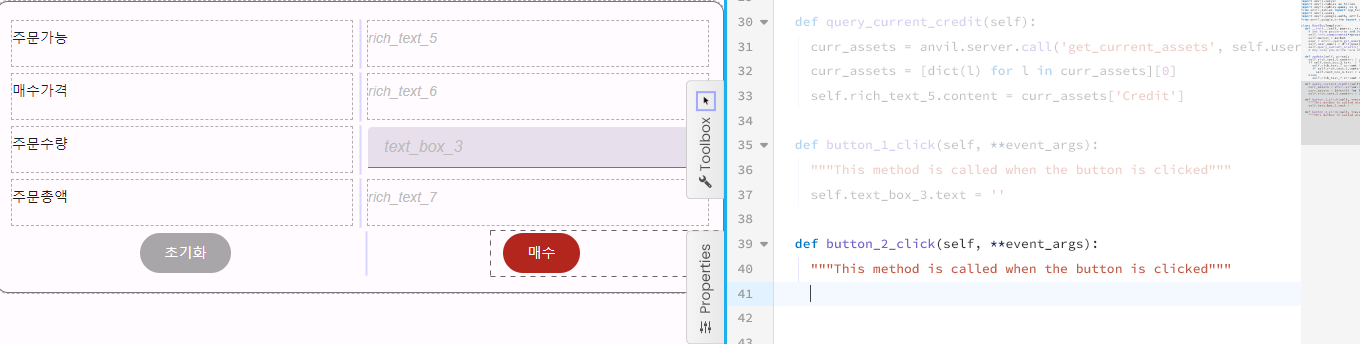 위와 같이 디자인 툴에서 매수 버튼을 더블클릭하여 간단하게 Code 영역에 이벤트 핸들러 구문을 생성하고 버튼에 해당 함수를 링크시켜준다. 그런 다음 아래와 같이 서버함수를 호출하게 만든다. 마지막으로 transaction 결과를 반영하기 위해 크레딧 정보를 갱신한다.