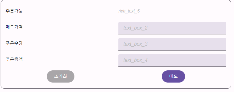 이전 글까지 매수/매도 창은 레이아웃만 존재했지 현재 나의 잔고나 주문 가능 수량등 아무런 정보도 보여주지 않았다. 이제 해당 창에 올바른 정보를 할당해주도록 하자.