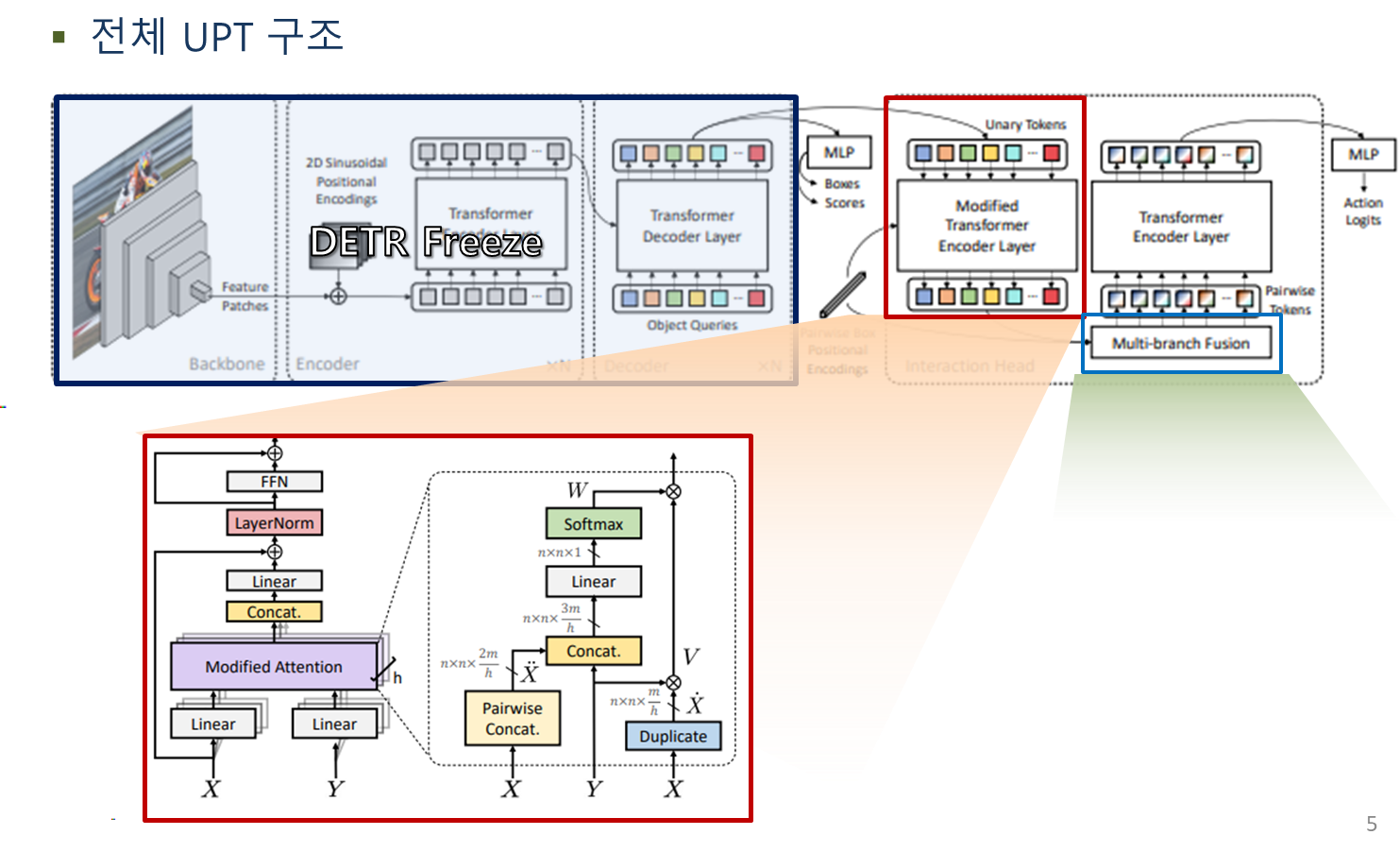 - DETR의 single-stage구조를 그대로 HOI로 transfer learning 하려면 대단한 양의 re-training이 필요하므로, DETR의 detection을 unary(1) token extractor로 유지하고, pairwise box positional encoding과 unary(1) object query를 입력으로 받는 2nd stage를 추가함.