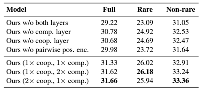 Ablation study 결과 각각의 레이어 자체가 성능 향상에 기여하는 모습을 확인할 수 있음.